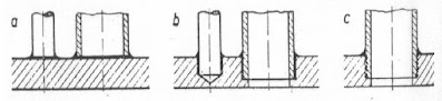 Tap yang dipatrikan secara menumpu (a) tidak mempunyai kekuatan yang besar (terutama melawan beban lentur). Lebih baik bila tap atau pipa dipatrikan membenam ke dalam lubang atau cowakan (b); dengan cara demikian terjamin juga kemantapan kedudukan. Jika di samping kekuatan yang baik dituntut juga kekedapan, maka bagian itu disekrupkan dengan ulir yang disepuh seng dan kemudian dipatri (c).